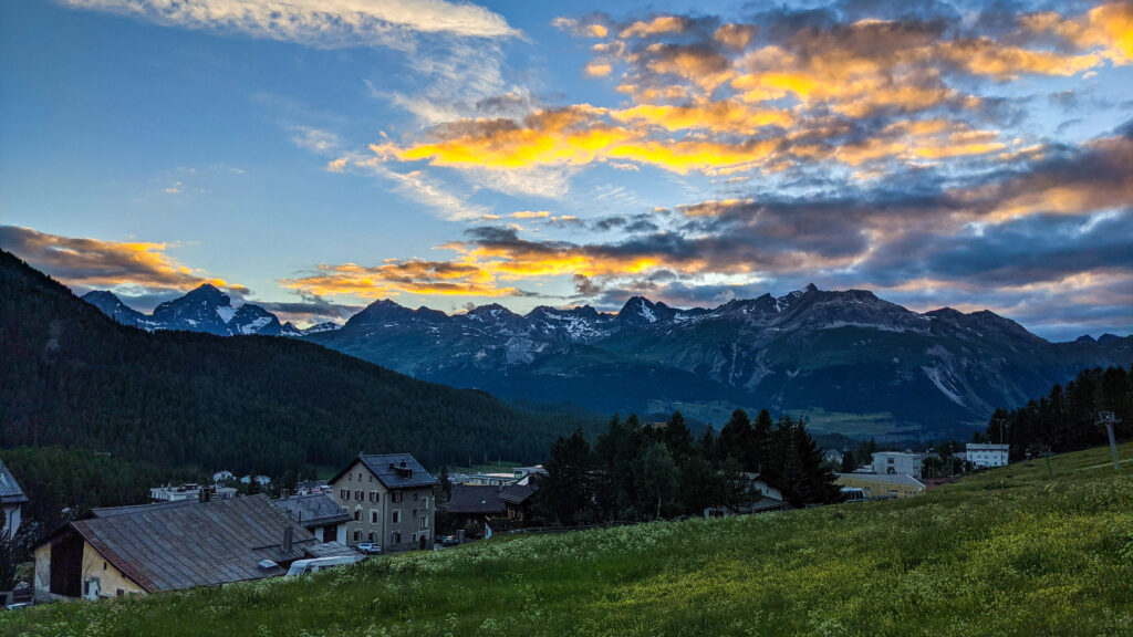 Hier oben war es ziemlich windig und uns stand noch der Rückweg bevor… Wir mussten auch wieder ins Tal nach Pontresina laufen, was nach 1.400 Meter Anstieg 1.400 Meter Abstieg bedeutete. Ich machte mich mit zwei Läuferinnen aus dem Chiemgau an den Abstieg zur Zielverpflegung. Entlang des letzten Streckenabschnitts kamen uns noch die letzten Läuferinnen und Läufer entgegen. Ich spürte schon, dass meine Beine schwer sind, und machte mir vor dem Abstieg etwas sorgen. In einem leichten Trab liefen wir als 3er-Gruppe bergab, was ganz gut klappte und für die Beine erträglich war. Leider bekam ich trotzdem zweimal einen Krampf in den Oberschenkeln. Nach kurzen Massagen ging es weiter dem Sonnenuntergang entgegen. Wir erreichten wieder den Wald und es war gut, dass Pontresina immer näherkam. Nach etwas mehr als einer Stunde hatten wir es geschafft und den Ort erreicht. Wünschenswert wäre, wenn der letzte Streckenabschnitt mit dem Sessellift zurückgelegt werden kann.