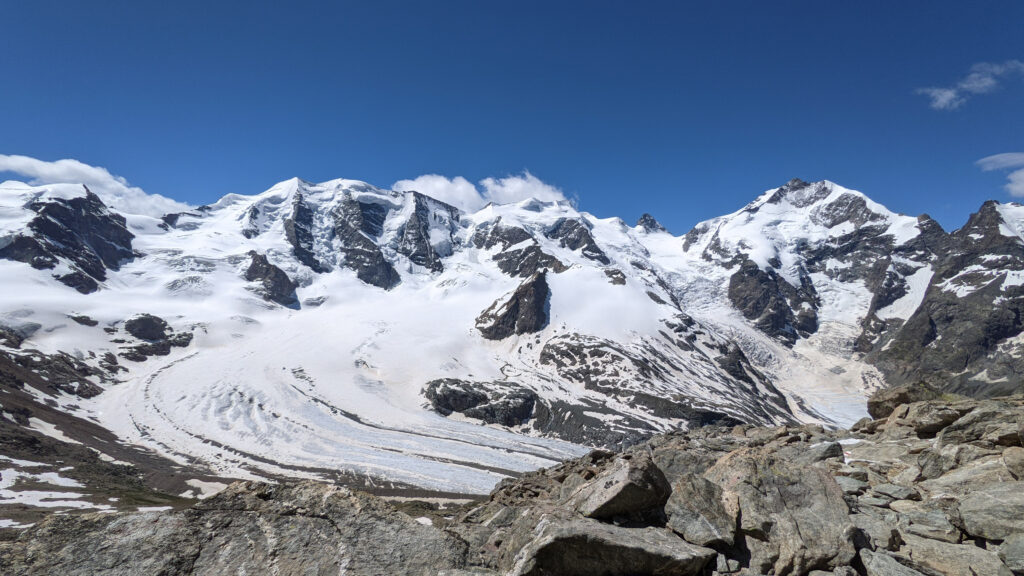 Entlang der Route durch den Wald passierte ich den Start des Wanderweges zum Morteratsch-Gletscher und einen sehr eindrucksvollen Wasserfall. Es ist ein wahres Schauspiel, den tief im Felsen eingeschnittenen Fluss zu sehen. Dies war auch der anstrengendste Teil der Strecke, bevor sich das Tal öffnete und es entlang von Wiesen zum Diavolezza ging. Dort angekommen fuhr ich mit der Seilbahn zur Bergstation auf 2.976 Meter. Während der Fahrt erkannte ich bereits die Streckenmarkierung und es verließ eine schwierige Passage zu werden. Oben angekommen war es einfach gigantisch! Die umliegenden Berge zum Greifen nah, gegenüber der 4.091 Meter hohe Piz Bernina und davor der Gletscher. Ich machte mich auf den Weg zum 3.207 Meter hohen Munt Pers, da die Aussicht von dort noch besser sein sollte. Unterwegs habe ich aber umgedreht und den Rückweg angetreten, da die Zeit eng wurde. Ich hatte ja noch einiges vor…