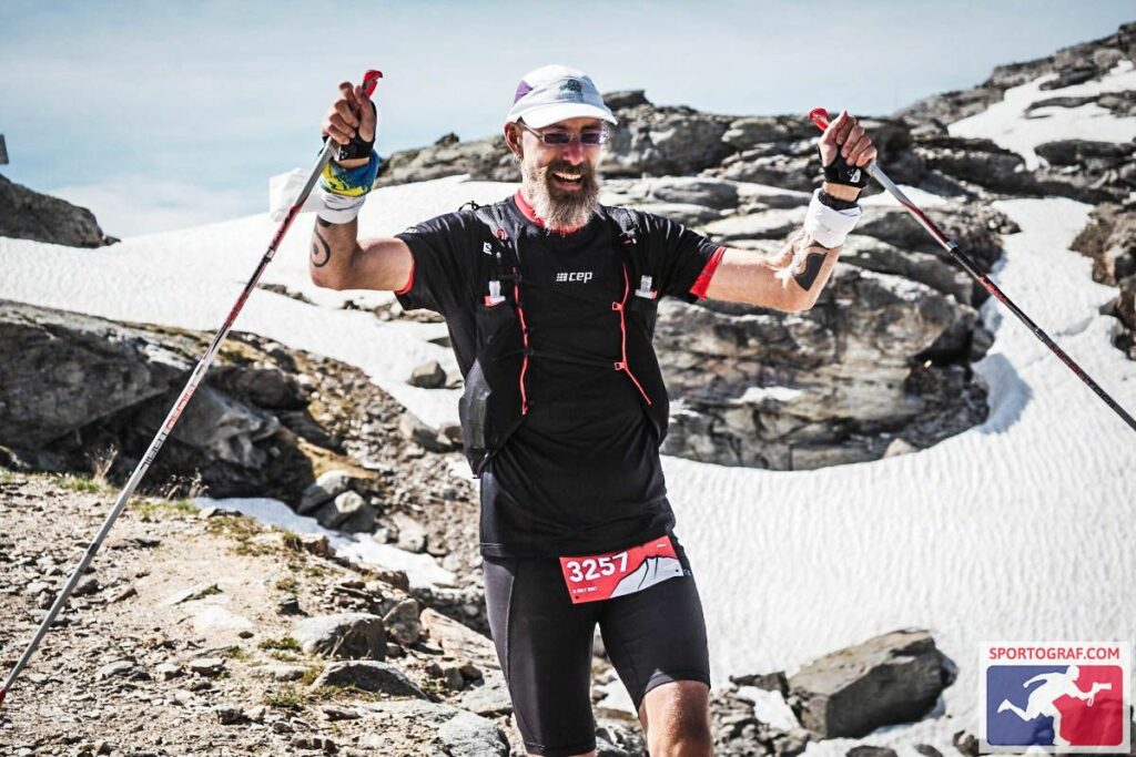 17 Uhr – der Start des GoVertical erfolgt Corona bedingt in mehreren Startwellen, mit Maske und Abstand. Nach dem Start bleibt nicht viel Zeit, bevor es bergauf geht. Wir laufen zur Talstation des Skilift Languard, weiter zum Panoramaweg über Pontresina und erreichen beim Burgturm Spaniola den Wald. Auf einem gut laufbaren Waldweg geht es zu einer Abzweigung, von der aus es in Zick-Zack bergauf geht. Nach einem Abschnitt mit Treppenstufen können wir in einer Kehre den Ausblick als Vorfreude genießen. Es geht immer weiter bergauf über Wurzeln und die Stöcke sind eine gute Unterstützung. Es ist warm und ich denke, es war vielleicht doch keine gute Idee mit einem langärmligen Shirt zu starten. Wieder am Waldrand angekommen öffnet die Landschaft und die Bergwelt zeigt sich. Die Kühe grasen auf den Almwiesen und ein schmaler Pfad führt uns nach oben. Wir halten uns links und erreichen bei knapp über 2.300 Meter die Bergstation der Seilbahn an der Alp Languard. Nach einer kurzen Pause an der Versorgungsstation geht es weiter, das Ziel ist mit 2 3/4 Stunden angeschrieben und ich frage mich, wie lange ich wohl brauchen werde… Es wird zunehmend felsiger und windiger, so dass ich um mein langärmliges Shirt doch froh bin. Unsere Strecke führt uns immer weiter hoch, wir nähern uns der 3.000er Marke und sehen die ersten Schneefelder. Der Weg wird zunehmend steiler und anstrengender, da auch die Luft in der Höhe dünner wird. Kurz unterhalb des Gipfels erreichen wir auf 3.180 Meter die Georgy´s Hütte, an der es später die Zielverpflegung gibt. Noch müssen wir aber auf den Gipfel und der Anstieg hat es in sich! Immer wieder kommen mir Finisher entgegen, die bereits, die es bereits geschafft haben. Der Weg passiert ein Schneefeld und wird nochmals schmaler. Es folgen Kletterpassagen, die mit Seil gesichert sind. An verschiedenen Stellen suche ich den besten Weg nach oben und dann ist es geschafft! Ich habe nach 2:06 Std. das Ziel auf dem 3.261 Meter hohen Piz Languard erreicht und bekomme eine Medaille umgehängt. Überglücklich bin ich, hole erst mal tief Luft und genieße das 360 Grad Panorama.