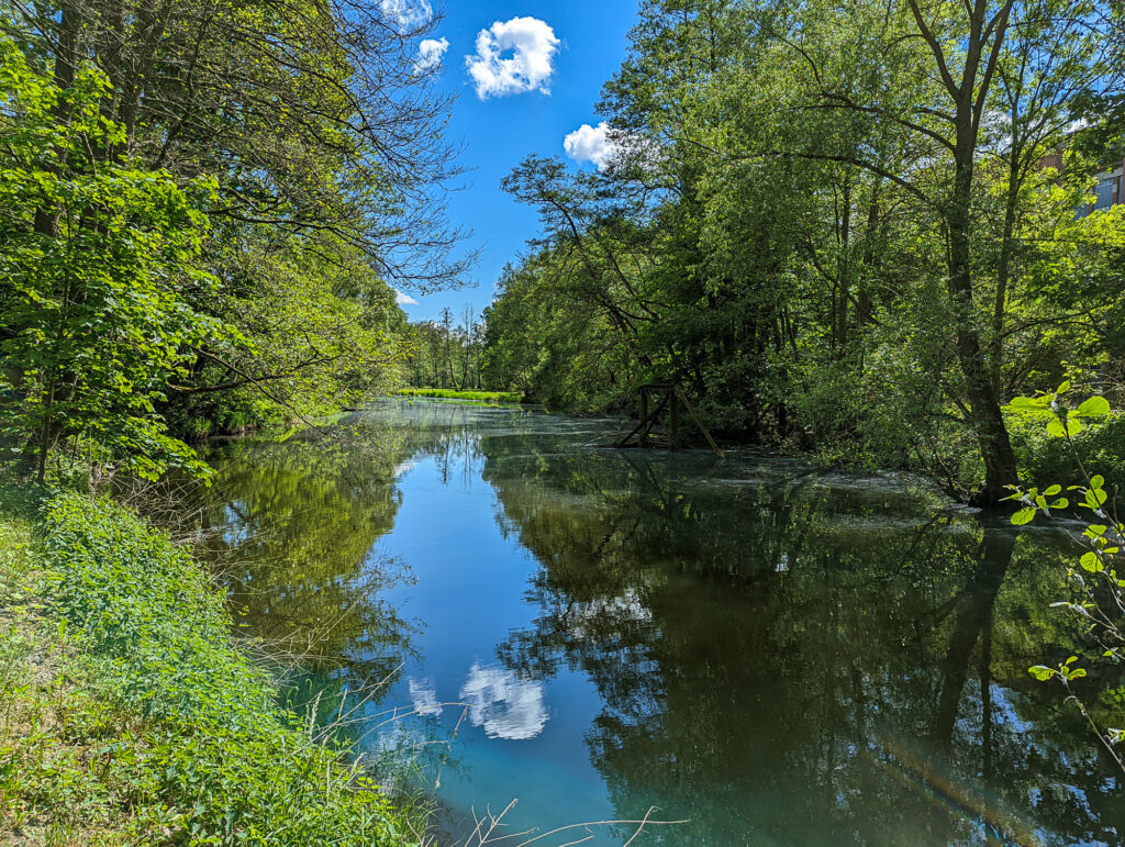 Bei km 15 erreichte ich wieder das Seeufer und anschließend die Brücke zum anderen Ufer. Ich blieb auf der westlichen Seite und lief den Weg nach Norden – immer direkt am Ufer mit schönen Liegewiesen und Bänken für eine Rast. Am oberen Ende des Sees lag ein schöner Spielplatz und ein Labyrinth. Ich blickte nochmals zum See und lief nach Christiansreuth weiter.
