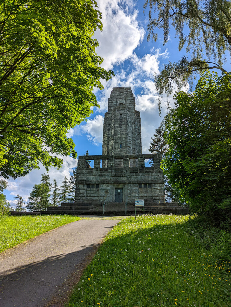 Nach einem kurzen Abschnitt durch den Ort ging es auf einem schmalem Weg über Wiesen, die in voller Blütenpracht standen. Es war einfach herrlich! Am Ortsrand lief ich weiter, dem höchsten Punkt der Strecke entgegen. Etwa bei km 23 erreichte ich den Bismarkturm auf einer Anhöhe. Auf knapp 600 Meter liegt der 1915 fertig gestellte, 25 Meter hohe Turm, dessen Besichtigung leider nicht möglich war.