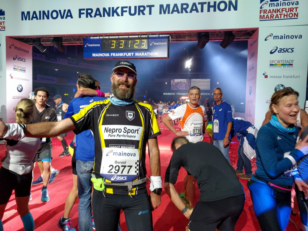 Mein Marathontempo konnte ich seit 2008 immer weiter steigern, musste aber feststellen, dass es harte Arbeit ist, die gesteckten Ziele zu erreichen: um die 3:30 Std-Marke zu knacken, dauerte es sehr lange und ich erreichte dieses Ziel erst 2017 beim Frankfurt-Marathon – 3:27:29. Entsprechend war die Freude groß! Endlich ist es geschafft!