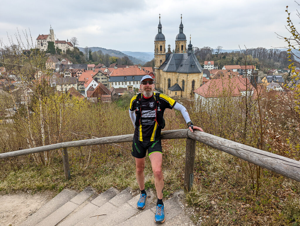 Bei Streitberg zeigte die Uhr knapp 60 km an und das Ziel kam immer näher. Ich wusste, dass uns noch ein letzter Anstieg erwartete und durch den Frankenweg-Trail kannte ich diesen… Es wird nochmal ziemlich anstrengend! Es ging durch den Wald, Gasseldorf war bereits angeschrieben und wieder folgten Treppenstufen. Wir liefen durch Felsen und erreichten den 472 Meter hohen Hummerstein. Es war geschafft – der letzte Anstieg des UTFS! Vom Berg aus sah man bereits den Zielort Ebermannsstadt. Aber es waren noch knapp 5 km zu laufen.