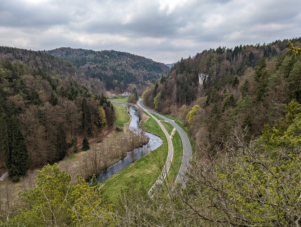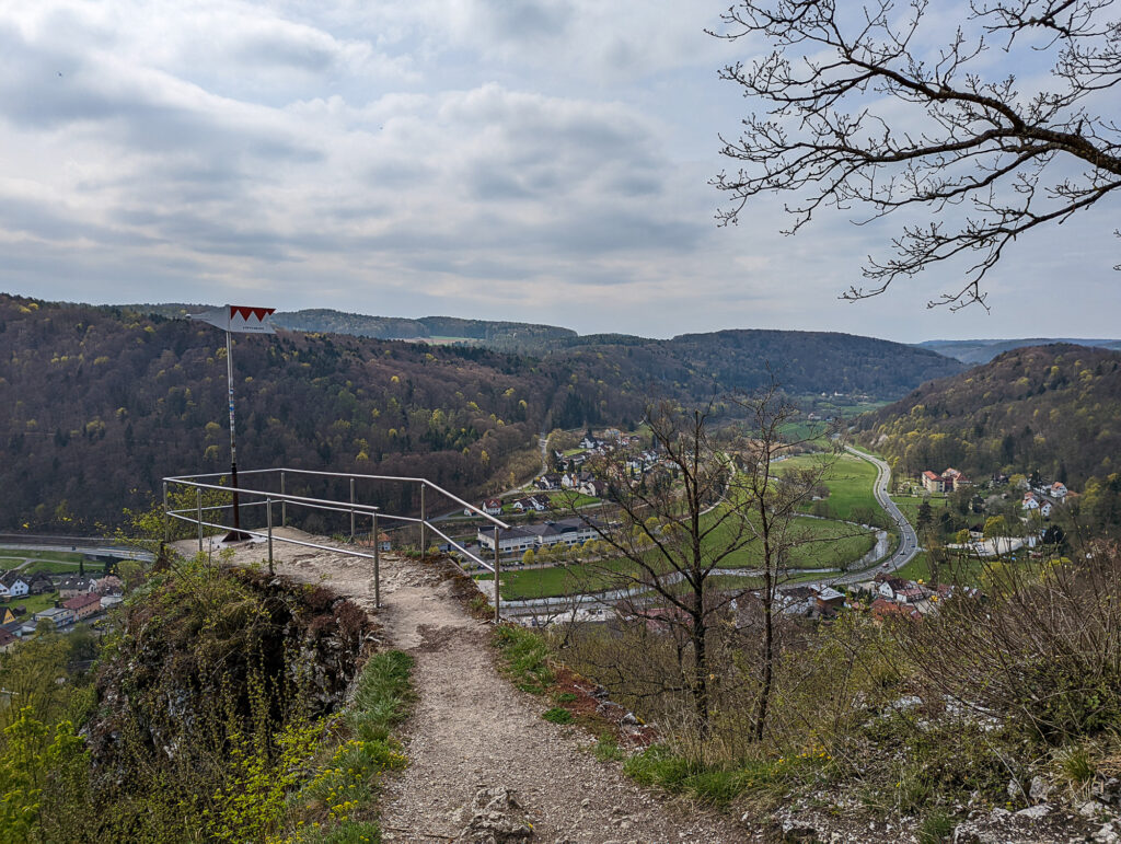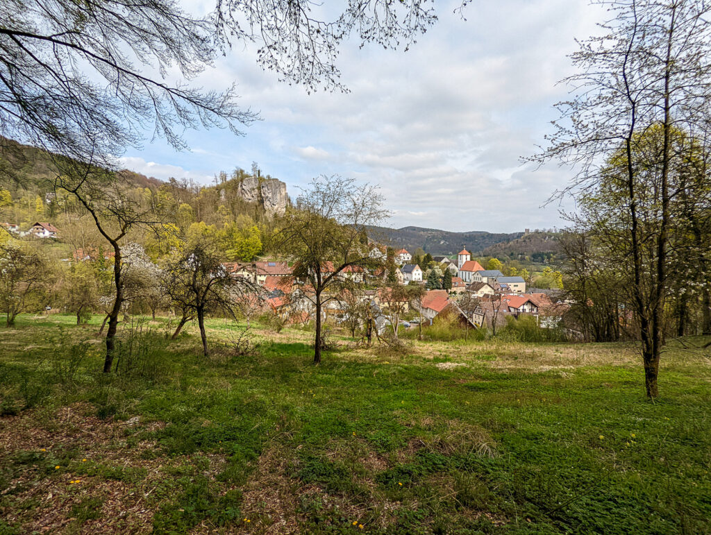 An der Wiesent angekommen, überquerten wir diese, um auf der anderen Seite gleich wieder etwas bergauf zu laufen. Die Strecke führte uns an der Saugendorfer Höhle vorbei und es wirkte wie wenn wir durch einen Urwald laufen würden. Nur etwa 1,5 km war dieser Abstecher lang, bevor es wieder ins Wiesenttal ging. Puh, anstrengend, dafür eine geniale Aussicht!
