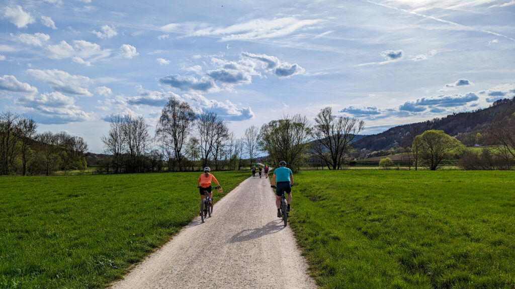 Etwa 5 km waren es von der Wiesent an der Burg Rabeneck bis zum Beginn des Anstieg an der Riesenburg. Inzwischen liefen wir wieder auf der Strecke aus dem Jahr 2022 und es folgten ein paar anstrengende Spitzen, die Kraft kosteten. Vor Doos ging es wieder ins Tal und wir liefen auf einem schönen Weg am Waldrand entlang, immer die Wiesent im Blick. Ich wusste bereits, was uns nun erwarten würde… der etwa 2km lange Anstieg zur Riesenburg und weiter hoch bis Engelhardsberg.